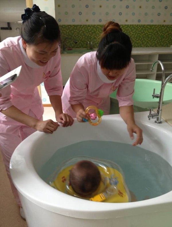 母嬰護理學(xué)員做嬰兒游泳工作