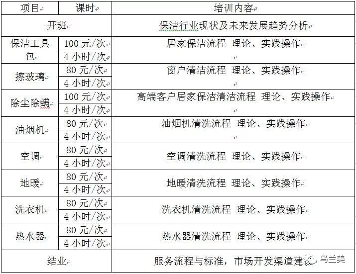 根據(jù)目前家政保潔市場需求及社會人員就業(yè)需要,經(jīng)公司研究決定,烏蘭美將推出家電清洗保潔培訓班。通過家電清洗保潔培訓班提高從業(yè)人員行業(yè)的操作專業(yè)水準,更好的為我市市民提供優(yōu)質(zhì)的服務。