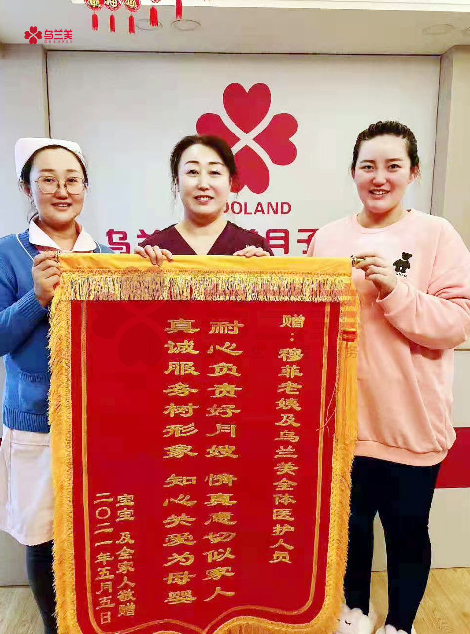 5月5日一大早,烏蘭美醫(yī)養(yǎng)月子中心的每一位母嬰護理師和工作人員的臉上,都洋溢著幸福的笑容??蛻粼S娜一家將一面印有“耐心負(fù)責(zé)好月嫂,情真意切似家人,真誠服務(wù)樹形象,知心關(guān)愛為母嬰”的錦旗,親自送到了烏蘭美醫(yī)養(yǎng)月子中心母嬰護理師穆菲(簡稱,穆姐)手里,以此感謝她對寶媽和寶寶無微不至的關(guān)懷與照護,并對烏蘭美健康集團的正規(guī)和專業(yè)表示了認(rèn)可!