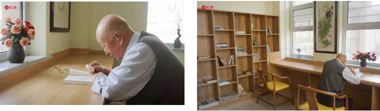 在烏蘭美康養(yǎng)院的圖書室里,人們常常會看到一位老人拿著放大鏡在埋頭讀書,一讀就是2小時。談及爺爺?shù)拈喿x愛好,老人家興奮地說:“我每天早上起來,在康養(yǎng)院內(nèi)散散步。九點左右就去康復訓練室里用按摩椅活動活動筋骨,九點半左右我就去圖書室了,一般看兩小時的書。每天中午和晚上睡覺前,我是一定要看一小時書的,這已經(jīng)成為了生活‘必需品’。”不少人感嘆王爺爺?shù)淖月?,他卻打趣道:“我也是勞逸結合!午睡后,我會到活動室打兩小時的麻將。”