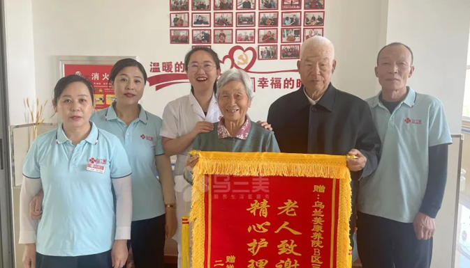2022年4月11日上午,烏蘭美康養(yǎng)院B區(qū)三樓全體工作人員收到入住長者王興禮爺爺、于守珍奶奶夫妻倆的一面印有“老人致謝送錦旗,精心護理暖人心”的錦旗,以表達對全體工作人員的感激之情。